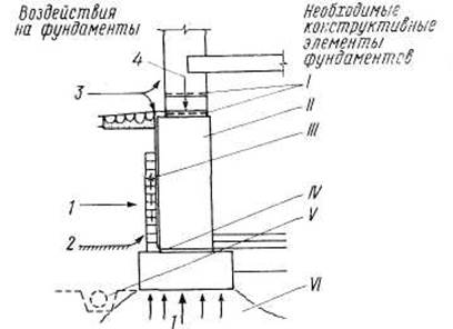 Воздействия на фундаменты: 1— грунта и грунтовых вод; 2 — промерзания и пучения; 3 — атмосферных осадков; 4 — нагрузок