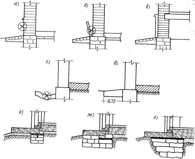 Усиление фундаментов может быть осуществлено путем укрепления их кладки, увеличением размеров — ширины и глубины заложения, а также передачей нагрузки на нижележащие слои грунта (рис. 2). Примеры повреждений и восстановления цоколей, отмосток и входных площадок приведены на рис. 3.
