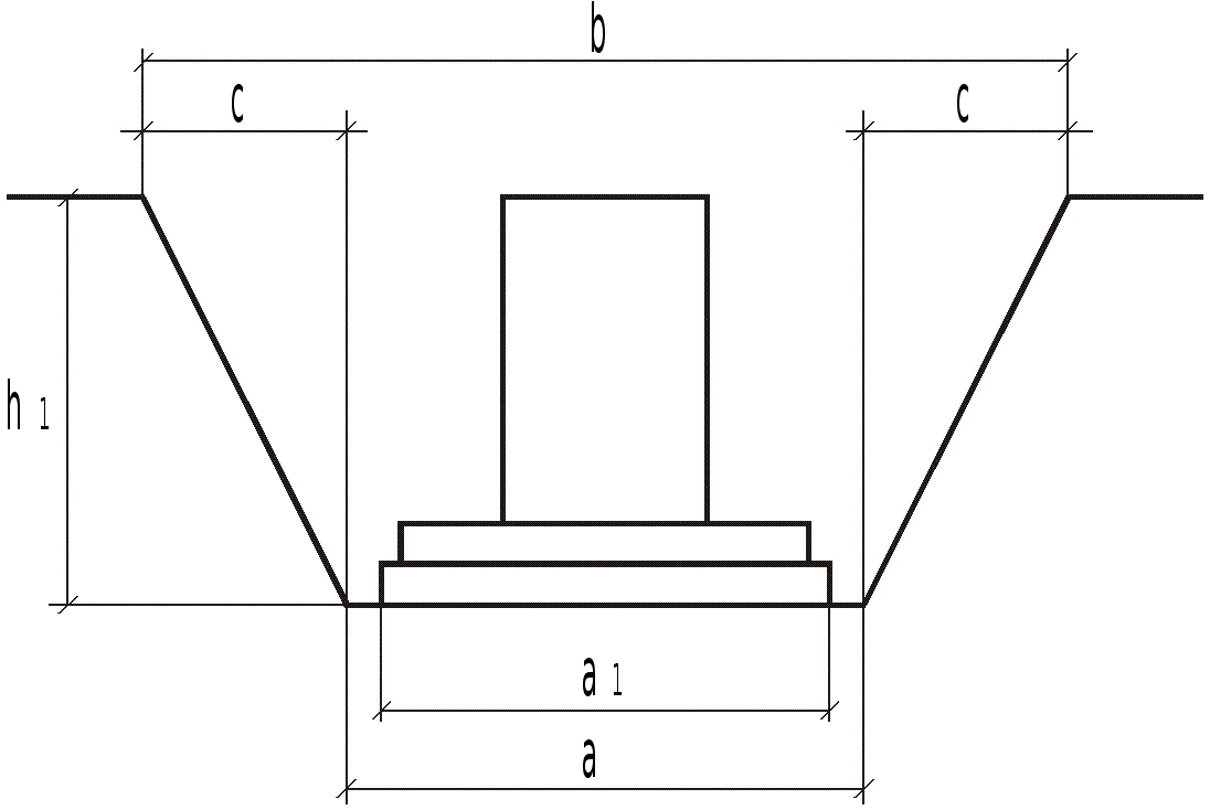 Размеры траншеи (см. рис.3): a1 = 2,4 м; a = 2,4 + 1,2 = 3,6 м; h1 = 3,0 м; c = 0,5*h1 =1,5 м; b = a + 2*c = 3,6 + 2*1,5 = 6,6 м.