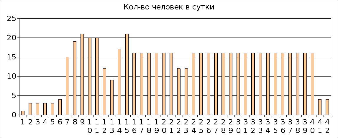 | Кол-во чел. в сутки: | 1 | 3 | 3 | 3 | 3 | 4 | 15 | 19 | 21 | 20 | 20 | 12 | 9 | 17 | 21 | 16 | 16 | 16 | 16 | 16 | 16 | 12 | 12 | 16 | 16 | 16 | 16 | 16 | 16 | 16 | 16 | 16 | 16 | 16 | 16 | 16 | 16 | 16 | 16 | 16 | 4 | 4 | |||||||||||||