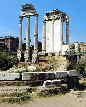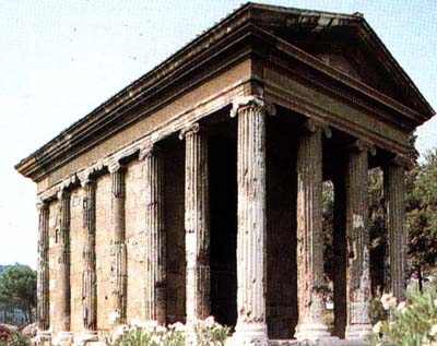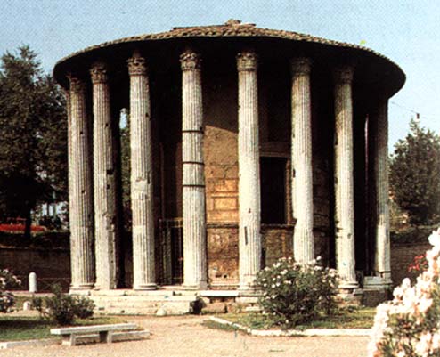 Деревянная архитектура с терракотовой орнаментикой полновластно царила в Риме в III в. до н. э. и только в следующем столетии начала уступать место каменным постройкам. Но храмы сооружали из мягкого вулканического туфа, так как своего мрамора в Италии во II в. до н. э. еще не было, и «лунский», позднее каррарский, мрамор, и «тибуртинский» твердый известняк стали применяться повсеместно только в эпоху Августа. Ограниченность в выборе строительного материала наложила заметный отпечаток и на саму архитектуру храмов. Из мягкого кампанского туфа не удавалось вытесать длинные прочные балки, поэтому зодчим приходилось создавать арочные своды. Кроме того, мягкий туф не позволял делать такие выразительные, подчеркнутые орнаменты, как на греческих мраморных храмах, и надо было украшать постройки гипсовой пластикой. Большим облегчением для архитекторов было начало применения в строительстве обоженного кирпича. Новая техника дала возможность сначала возводить каркас стен, а затем облицовывать их плитами из туфа.