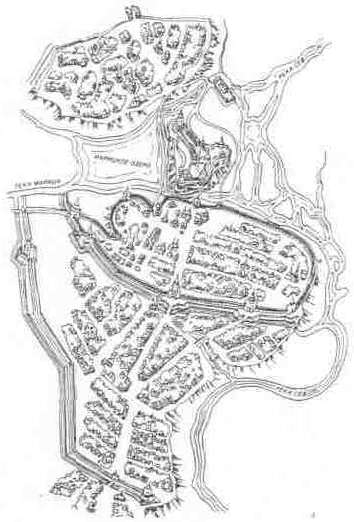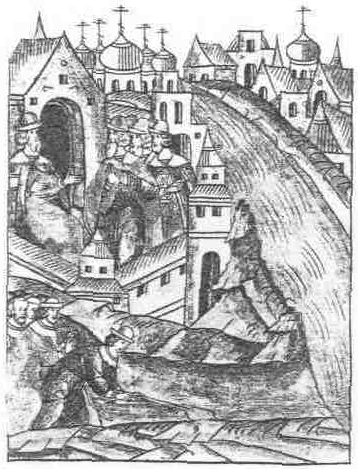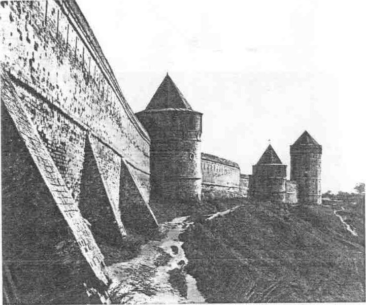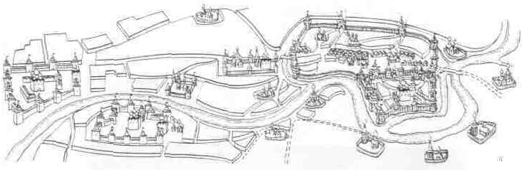 Подобно стенам города торжественно освящались и «оклады» отдельных зданий, в первую очередь культовых. Храм, дом и город имели некое внутреннее родство, общую универсальную символическую основу. Это были не столько взаимодополняющие части одного целого (они могли существовать и независимо друг от друга), сколько разные формы воплощения Макрокосма в Микрокосме. Крепостное ядро города можно было, таким образом, сопоставить со зданием, с неким архитектурным монументом, иногда очень пластичным, доминирующим над подвластной ему территорией. С наибольшей силой выразительности эта грань образа древнерусских городов запечатлелась в их детинцах. Приведем в качестве примера Псков, где детинец, называвшийся Кромом, располагался на скалистом мысу при впадении р. Псковы в р. Великую и представлял собой грозную крепость, отрезанную от посада рвом —«Греблей» (куда обращались его «Перси») и, казалось бы, противопоставленную ему, наподобие западноевропейского феодального замка. Но в Пскове это был вечевой центр —«сердце» и «страж» всех городских «концов» и всей псковской земли. Суровая неприступность городского ядра адресовалась врагам. Для хозяев оно было надежным убежищем, «закромами», хранителем их святынь, имущества и самих жизней. Нечто подобное можно видеть и в других древнерусских городах, где во время вражеских набегов жители посадов и пригородных сел затворялись в детинцах, а свои посадские дворы зачастую сжигали собственными руками. В детинцах или кремлях, как они стали называться в Московское время, судя по писцовым книгам XVI — XVII вв. и другим источникам, находились именно «осадные» дворы или дворы «для осадного сидения», пустовавшие в мирное время.