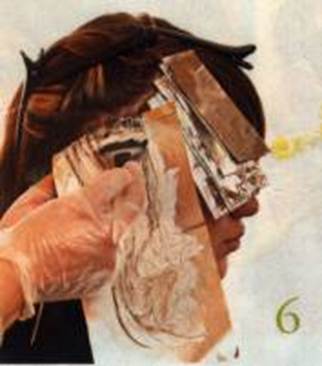 Выделить произвольную прядь на фронтальной зоне и выполнить мелирование на фольгу, используя Wella Blondor Crеme и 6% оксидант.