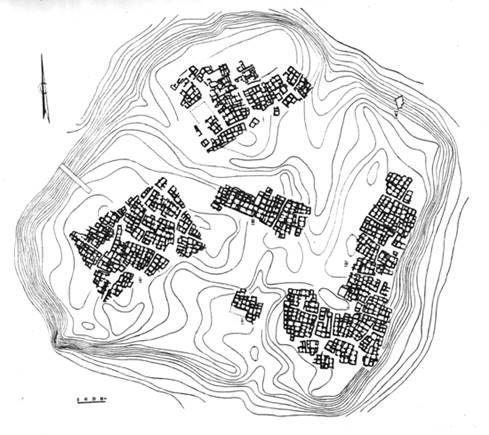 В хорошем состоянии восточный участок внешней стены. Изнутри к ней примыкают кварталы застройки, разделенные двумя пересекающимися улицами. Наибольшая удаленность стены с востока - 750 м, считая от середины восточной стены главного бугра.
