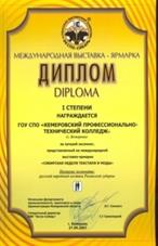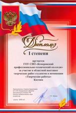 · участие в выставках: «Как рождается сказка» (Областной краеведческий музей), «Сибирская неделя текстиля и моды» (выставочная компания Экспо-Сибирь), областная вставка творческих работ студентов СПО;