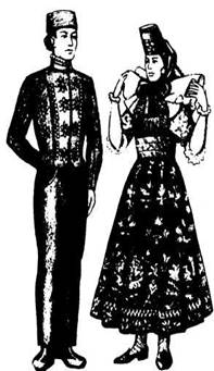 Голову невесты 18 века покрывали различных фасонов короны зеленого цвета. Иногда вместо короны надевали венок из мирта. К концу 18 – началу 19 века венок из мирта был вытеснен венком из розмарина 2 . До начала 20 века сохранился обычай закрывать невесту покрывалом: по народным верованиям, оно защищало ее от злых духов. Этому же служила и белая вуаль, ставшая с начала 19 века непременным элементом свадебного наряда невесты.