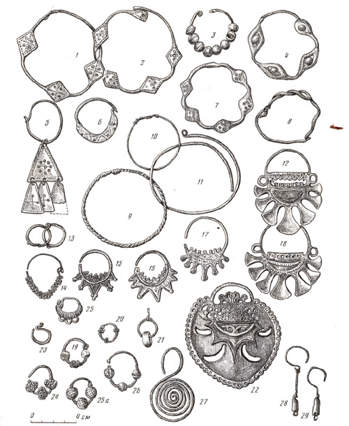 3. лучевые и лопастные - литые украшения, состоящие из полукольца-дужки и пластинчатой фигурной части;