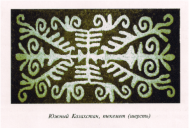 Для орнамента также важно соблюдение законов симметрии: обе его стороны должны быть равными. Чтобы вырезать орнамент для определенного изделия, сначала делается образец из бумаги. При создании орнамента необходимо знать, что особую красоту ему придают краски. В казахском прикладном искусстве используются традиционные цвета, которые применяются мастерами в течение многих веков: красные, синие, желтые, зеленые, белые и черные. Эти цвета имеют только им одним присущую символику. Синий - цвет неба; белый - символ истины; желтый - цвет мудрости, нравственности, печали; зеленый — молодости, весны и т.д. Соответствие цветов друг другу, их гармоничное сочетание называют колоритом. В многоцветных узорах-орнаментах часто встречается совершенный колорит. При создании орнаментов, кроме законов симметрии, необходимо также соблюдение ритма.