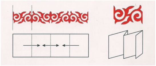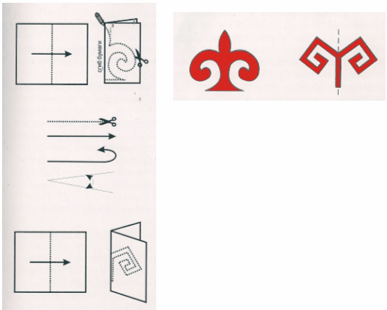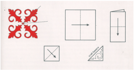 Ход выполнения: рисуем на углу сложенного в три раза листа бумаги половину орнамента "төртқұлақ" и вырезаем его ножницами. Орнамент вырезается не из того угла листа, который сложен, а с края. Вырезанный образец орнамента наклеиваем на бумагу другого.