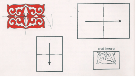 Ход выполнения: Учитель рисует на сложенном вдвое листе бумаги эскиз половины орнамента "қосалқа" и вырезает его ножницами. Вырезанный орнамент наклеивает на бумагу другого цвета и показывает ученикам. Таким образом, учащиеся обучаются нескольким методам создания орнамента "қосалқа".