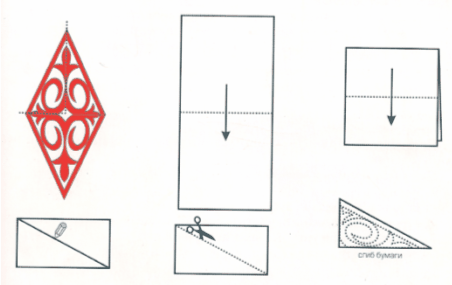 Ход выполнения: Для создания цельной композиции ромбовидного орнамента бумагу складывают втрое. Получается прямоугольник. Затем вдоль пунктирной линии, соединяющей противоположные углы, еще раз. Получается треугольная фигура в виде амулета — тумара. Сторону, противоположную прямому углу, считают центром орнамента. От центра рисуем карандашом эскиз орнамента. Затем начинаем вырезать орнамент со стороны свернутого края треугольника.