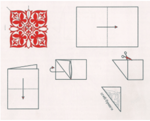- Вырезание орнамента на бумаге, сложенного в 2 раза