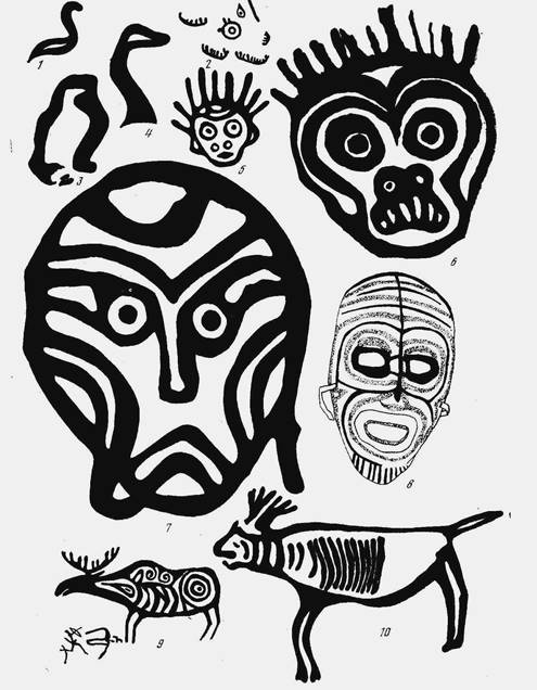 1,3,4 – изображение птиц, 2 – изображение лодок, 5-7 – личины, 8 – шаманская маска, 9-10 – лоси