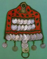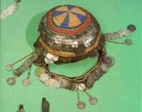 Для украшения головных уборов мастерицы выбирали монеты не только по их размерам, но и по звучанию. Монеты, пришиваемые к остову, прикреплялись плотно, а свисающие с краев - свободно, и между ними оставались промежутки, чтобы в о время танцев или хороводов они издавали мелодичные звуки. | ![]() |