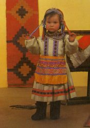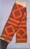 Своеобразной формой отличались женские головные уборы хушпу. Они бывают двух видов конусообразные и шлемовидные, имеют "хвост"- деталь спускающаяся на спину.Двух видов бывают и девичьи головные уборы тухья - островерхие и без острия, наспинной части у них нет. Художественные приемы, использованные в шитье, богаты и разнообразны. Мастерицы с большим умением и вкусом размещали каждую монету и бисеренку. Среди изделий из серебра и бисера в одном ряду с тухья и хушпу находятся женские и девичьи нагрудные украшения шулкеме. В отдельных этнографических подгруппах их называли также подвеской к супрану или ама. Девичье украшение в отличие от женского не имело треугольной детали, служащей для крепления сурпана и был одноярусным. У верховых чуваш шулкеме состоял в основном из двух одинаковых частей и имел квадратную форму, а у низовых и промежуточных - полуовальную и прямоугольную. Среди шитых серебром и бисером предметов особое место занимает женское и девичье украшение - тевет. Надевали его через левое плечо. Женщины носили тевет в основном на свадьбах, а девушки - во время весеннего обряда "девичья пашня", в хороводах и на осенних праздниках, посвященных овину, первому хлебу и льну. Одним из традиционных праздников был "девичье пиво" - в честь хмеля и нового пива, когда все девушки участницы обязательно должны надевать тевет. Костюмы чувашей и их орнаментация различались по трем этнографическим группам. Узоры низовых вышивались на домотканом белом холсте всегда крупные, полихромные. Основной орнамент часто исполнялся нашивкой широкими полосами маренового цвета и сопровождался мелким узором. Для орнаментации характерны черты монументальности. Мастерицы-вирьялки, кроме белого холста, применяли также цветную основу, любили мелкий, филигранно выполненный орнамент. Костюм их отличался формой ношения. Непременной принадлежностью их туалета были черные онучи. Костюм и узоры средненизовых более близки к низовым. Женские рубашки отличались богатой орнаментацией нагрудной части. Ее украшали узоры , розетки. Розетки состояли из наложенных друг на друга спицеобразных фигур. Узоры имели форму ромба. Среди них большой интерес представлял сложный орнамент , имеющий ассиметричную композицию, которая встречается только в вышивке рубашек замужней женщины. Орнаментация женского костюма подчинялась общей композиции. Подол, по сравнению с другими частями рубашки, вышивался более скромно, в его украшении соблюдался четкий ритм. Большую роль играло ритмичное чередование широких и узких полос, включающих в себя нашивки и геометрические узоры. Свой природный дар и умение чувашские мастерицы раскрывали в украшении набедренников. Носили их как в праздничные дни, так и в будни. Для исполнения узоров применяли шелковые и шерстяные нити. Вышивка была односторонняя, широко использовалась нашивка. Длинная бахрома, коричневого или синего цвета, обогащала набедренник при движении, играя на белом фоне рубашки, оживляя весь костюм женщины. |