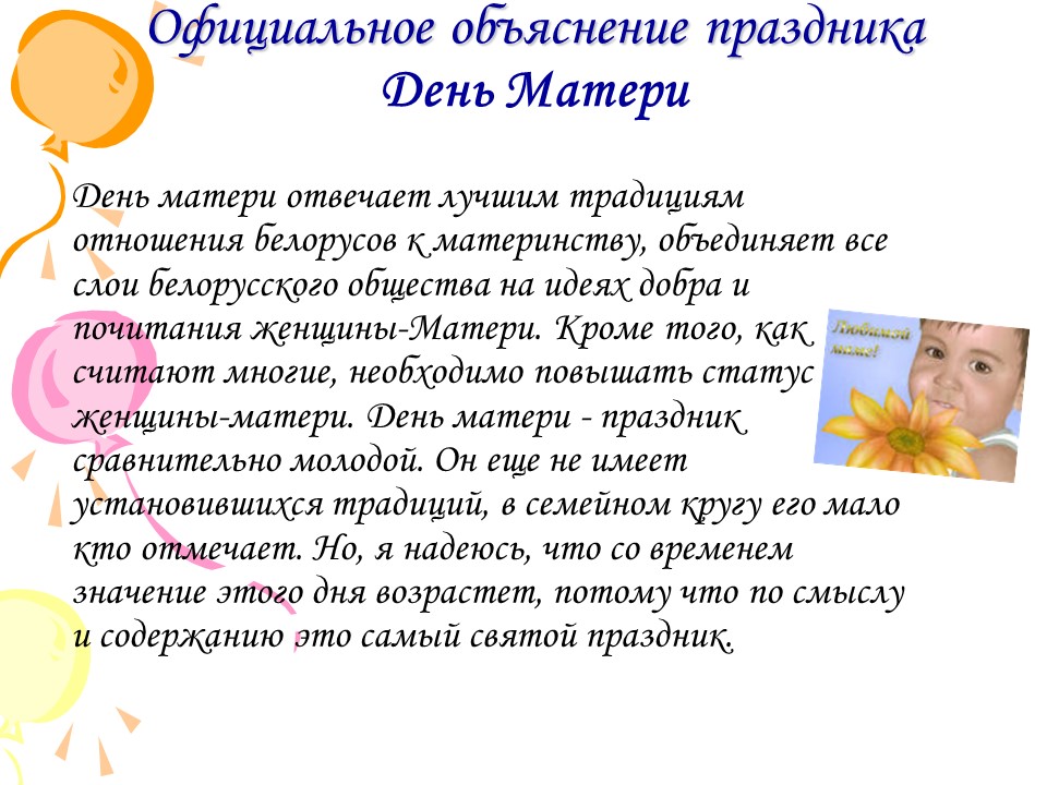 День матери отвечает лучшим традициям отношения белорусов к материнству, объединяет все слои белорусского общества на идеях добра и почитания женщины-Матери. Кроме того, как считают многие, необходимо повышать статус женщины-матери. День матери - праздник сравнительно молодой. Он еще не имеет установившихся традиций, в семейном кругу его мало кто отмечает. Но, я надеюсь, что со временем значение этого дня возрастет, потому что по смыслу и содержанию это самый святой праздник.