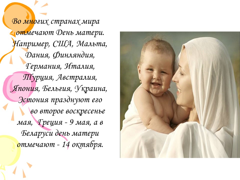 Во многих странах мира отмечают День матери. Например, США, Мальта, Дания, Финляндия, Германия, Италия, Турция, Австралия, Япония, Бельгия, Украина, Эстония празднуют его во второе воскресенье мая, Греция - 9 мая, а в Беларуси день матери отмечают - 14 октября.