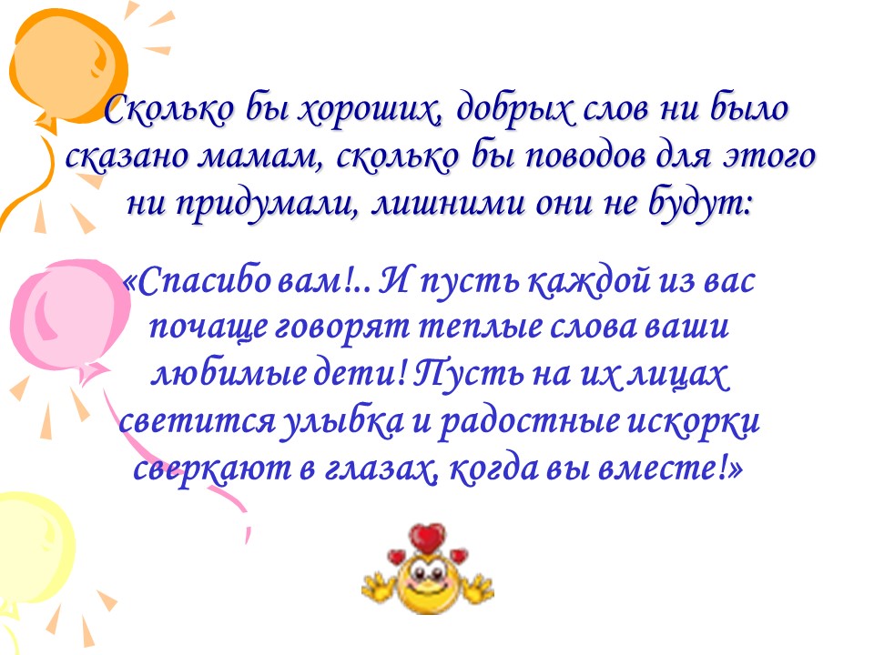 «Спасибо вам!.. И пусть каждой из вас почаще говорят теплые слова ваши любимые дети! Пусть на их лицах светится улыбка и радостные искорки сверкают в глазах, когда вы вместе!»