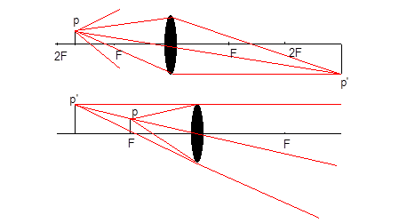 б – точка P’ – мнимое прямое увеличенное изображение точки P.