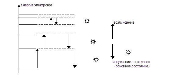 Известно, что при нагревании тела скорость перемещения (диффузии) отдельных компонентов увеличивается По мере увеличения температуры твердого тела, прежде всего, разрушается кристаллическая решетка, затем вещество переходит в жидкое состояние и, в конце концов, происходит испарение (переходит в пар). Что же произойдет при дальнейшем повышении температуры? Представим себе, танцевальные пары в переполненном зале вынуждены двигаться все быстрее и быстрее; столкновения станут неизбежны со всеми вытекающими последствиями. В паровой фазе также при нагревании, то есть при поступлении дополнительной энергии, молекулы вынуждены разрушаться, то есть диссоциировать на отдельные атомы. Энергию, сообщаемую атомам при многократных соударениях, прежде всего воспримут электроны, расположенные на внешних оболочках, то есть валентные электроны. Допустим, что после очередного удара валентный электрон поглощает дополнительную энергию. Если последняя достаточна для перехода электрона на незанятый электронный уровень с более высокой энергией, совершается соответствующий электронный переход, и атом оказывается в так называемом возбужденном состоянии. Возбужденное состояние атома неустойчиво, и рано или поздно электрон вновь возвратится на свою основную орбиту, и атом потеряет приобретенную энергию, испуская фотон (рис.6).