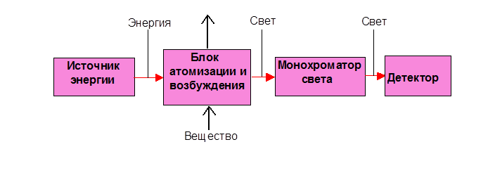 При изучении спектров испускания (эмиссионных спектров) к пробе необходимо подвести энергию, достаточную для того, чтобы разорвать связи между атомами, то есть атомизировать вещество, а затем возбудить образовавшиеся атомы. Испускаемые фотоны фокусируют, разделяют по энергиям и оценивают излучение по энергии при интенсивности (рис.7).