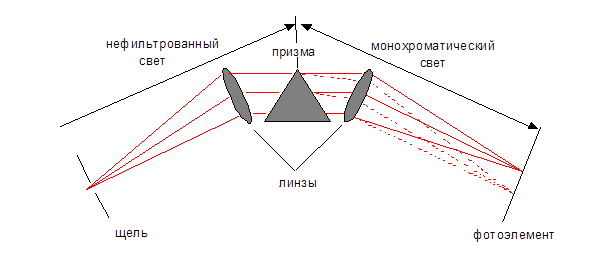 При спектрофотометрическом анализе световой поток видимого или ультрафиолетового излучения от источника света через систему оптических зеркал попадает в монохроматор, где свет разлагается на отдельные компоненты, из которых выходная щель монохроматора в зависимости от угла поворота решетки выделяет свет определенной длины волны (близкого диапазона волн). Такой «профильтрованный» свет и попадает на образец. Путем поворота монохроматора можно добиться того, что на анализируемый образец. Путем поворота монохроматора можно добиться того, что на анализируемый образец будет попадать свет заданной длины волны. Интенсивность светового потока, проделавшего путь от источника излучения через монохроматор и образец, измеряется в фотоприемнике. По устройству спектрофотометры, работающие в видимой и ультрафиолетовой областях спектра, между собой почти не отличаются, однако для исследования в ультрафиолетовой области необходим особый источник излучения и специальные кварцевые кюветы, поскольку обычное стекло поглощает ультрафиолетовые лучи.