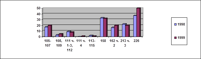Самым распространенным преступлением в общем объеме преступности являются кражи. В структуре этого вида преступления количественно преобладают кражи имущества граждан (треть из них - квартирные). Из общего числа зарегистрированных краж в 1999 году (1 365 191) на все остальные виды краж, то есть когда потерпевшим является юридическое лицо, приходилось лишь 372 000.