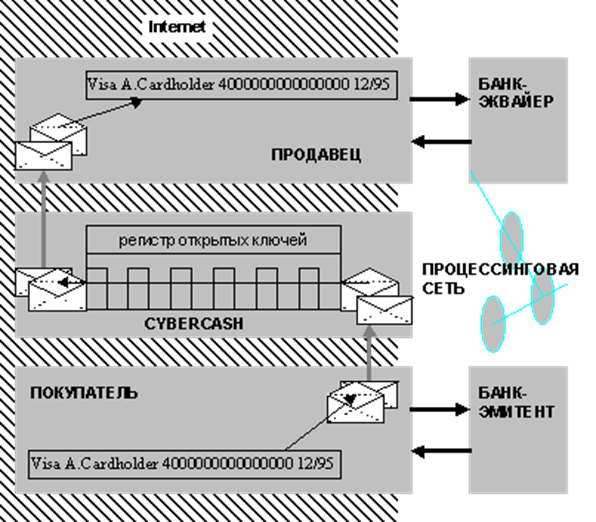 CyberCash. Компания CyberCash, расположенная в г. Рестон (штат Вирджиния, США) была пионером в разработке многих концепций, использованных в стандарте SET, и приняла на себя обязательство одной из первых внедрить SET. Множество покупателей и торговых организаций по всему миру используют систему SIPS (simple Internet payment system) производства CyberCash. Есть стимул для использования программного обеспечения CyberCash: в дополнение к повышенной безопасности программное обеспечение поставляется свободно (т.е. бесплатно) как покупателям, так и продавцам. Плата за использование системы CyberCash включается в оплату за обслуживание кредитных карточек. Торговым организациям необходимо лишь иметь счет в банке-участнике и поместить кнопку PAY на свою Web страницу на соответствующем шаге процедуры оформления заказа. Когда покупатель нажимает на эту кнопку, он инициирует процесс выполнения расчетов по покупке в системе.