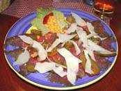 - это тонкие кусочки сырой говядины, приправленные оливковым маслом с уксусом и/или лимонным соком. Мясо обжигают, потом приправляют и нарезают. Карпаччо подается на листе салата с сыром Пармезан. Блюдо было избретено в Венеции в 1961 году и названо в честь живописца эпохи Реннесанса Витторе Карпаччо, чьи картины изобиловали всевозможными оттенками красного.