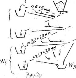 Вторую навеску пропускают через сепаратора до полного освобождения сит от сходового продукта. Полученные три фракции взвешивают на весах. Результаты взвешивания, выраженные в процентах в исходной смеси, рассматривают как выход каждой фракции W ] , W 2 и W 3 .