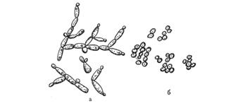 Рис. 3. Несовершенные дрожжи: а — род Candida; б — род Torulopsis