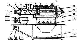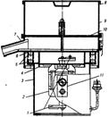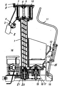 7-крышка, 8-опоры скребков, 9-шнек, 10-сито, 11-подъемник, 12-бункер, 13-решетки, 14-крыльчатка, 15-крестовина, 16-платформа, 17-стакан, 18-клиновой ремень, 19,20,21-шкивы