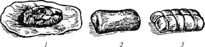 1 — відбитий шматочок м'яса з начинкою; 2 — крученик у вигляді валика; З — крученик, перев'язаний ниткою