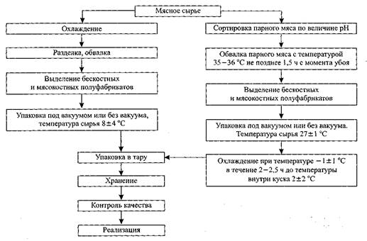На рисунке 1 приводится технологическая схема производства натуральных бескостных и мясокостных полуфабрикатов из говядины, свинины и баранины.