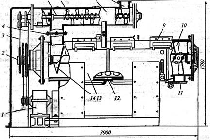 Общий вид машины приведен на рисунке 1.3. Станина машины собрана из чугунных плит 1, 3, 4, 15, которые скреплены с чугунными корпусами редуктора 5 и смесительной камеры 9. На плите 1 укреплен электродвигатель 2, а на плите 3 – мотор редуктор 5, натяжной ролик 16 и редуктор 14. Для удобства очистки камера предварительного смешения снабжена откидной крышкой 7 с петлями и винтовыми зажимами 8. Для облегчения открывания крышки ее петли снабжены устройством, компенсирующим массу крышки. Загрузочная воронка имеет боковые дверки 6, открытие которых облегчают доступ для очистки смесительной камеры. Крышки и дверки снабжены резиновыми уплотнителями, герметизирующими место разъема.