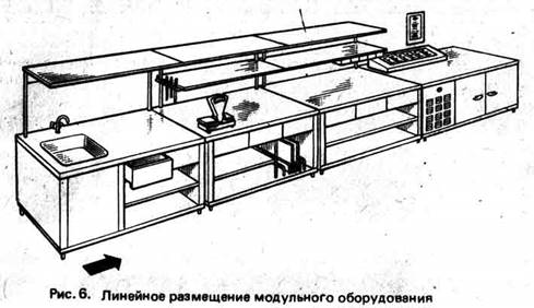 Для организации рабочего места повара устанавливают модульные секции – с охлажденным шкафом и горкой для хранения компонентов холодных блюд, с встроенной ванной, над которой закреплены смеситель холодной и горячей воды с гибким шлангом и душевой насадкой. Под столешницей предусмотрена вспомогательная полка для хранения посуды и выдвижные ящики. Удобен стол – секция с ящиками и полками, предназначенный для установки и подключения к электрической сети средств малой механизации.