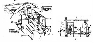 Рисунок 2 - Линия фирмы «Stork-Duick» (Нидерланды): а — участок переработки сырья: 1— приемный бункер для сырья; 2 — наклонный шнек; 3 — электромагнит; 4 — дробилка; 5 — стерилизационный аппарат(эквакокер); 6 — центрифуга; 7—циклон; 8 — дренажное устройство; 9 — сборник для жира; 10 — шнековый пресс; 11 – щит управления. б — участок обработки муки: 1— цепной ковшовый элеватор; 2 — шнековые конвейеры; 3 — промежуточный бункер-охладитель; 4 — шнековый пресс; 5 — разгрузочный бункер; 6 — вибросито; 7 — дробилка.
