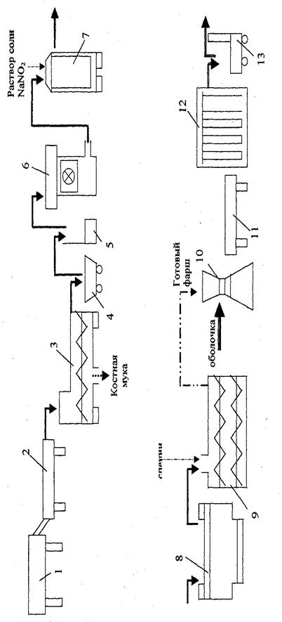 Посоленное и выдержанное при низкой температуре мясо обрабатывается на куттере (8) для более тонкого измельчения. Измельченное мясо смешивается в фаршемешалке (9) с пряностями, крахмалом, мукой, аскорбинатом натрия и измельченным шпиком течение 5-8 минут до получения однородной массы фарша.