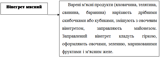 Вінегрети: додають варені буряк , моркву, картоплю, цибулю, квашену капусту, солоні огірки, оселедець, варену капусту, м’ясо, солоні мариновані гриби.