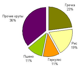 Рисунок 1. Доли разных круп в общем объеме производства в России, 2007г., % (по данным Росстат, ИКАР)