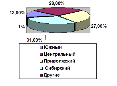 На рисунке 2 представлены доли основных федеральных округов – производителей гречневой крупы за 2008 год.