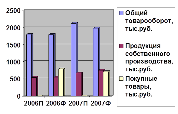 На основании данных таблицы, планируемый товарооборот продукции собственного производства в 2007 году превышает товарооборот в 2006 году на 2653,00 рубля, а оборот по покупным товарам в 2007 году меньше, чем 2006 году на 8095,00 руб. Это говорит о том, что реализация продукции собственного производства развивается и приносит большую прибыль с каждым годом.