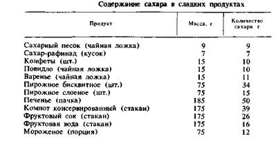 Конфеты, пирожные, торты, мороженое и другие кондитерские изделия (ассортимент которых превышает 1000 наименований) являются наиболее вкусными источниками углеводов (сахарозы) и обладают высокой калорийностью, но низким содержанием незаменимых факторов. Основа этих сладостей — сахар, как сейчас говорят, является носителем пустых калорий. Никакой ценности, кроме энергетической, у него нет. Для полнеющих людей, пожилых и ведущих малоподвижный образ жизни избыток чистого сахара (калорий) повышает синтез холестерина, нарушает жировой обмен, а следовательно, повышает риск сердечно-сосудистых заболеваний, сахарного диабета. Кроме того, сахароза не откладывается в печени в виде запасов гликогена, как это происходит при избытке глюкозы и фруктозы, а перенасыщает собой организм. Поэтому потребность организма в сахаре надо удовлетворять фруктозой и глюкозой, которые содержатся в фруктах (пить чай не с сахаром, а с вареньем, предпочитать пирожные не со сладким кремом, а с фруктовыми начинками и т. д.). (11, 191 с.)