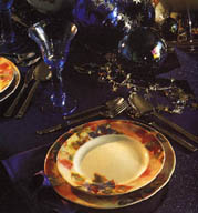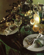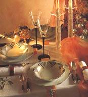 Под выбранную посуду подберите скатерть. Как вариант можно взять черную муаровую скатерть, которая в сочетании с новогодними золотистыми и серебряными украшениями и соответствующим фарфором выглядит довольно благородно.
