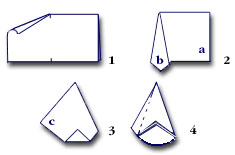 Копье с манжетом (французская салфетка, шляпа, кулек). Салфетку сложить открытыми сторонами к низу (1). Наметить середину и левую половинку завернуть к середине (1). Уголок "a" уложить на угол "b" и все 4 кончика салфетки заломать кверху (3). Угол "c" ставится свободно, слегка разворачивается (4). Салфетке придают устойчивую форму, слегка округляя и устанавливая стоя. |