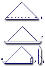 Свеча . Салфетку сложить по диагонали треугольником открытой стороной вверх (1), заломать снизу вверх полосу шириной 2 см (2) и свернуть трубочкой всю салфетку справа налево (3), а наружу выступающий уголок "a" вложить с паз нижней полоски салфетки (4). Такую "свечу" можно установить в нарядном новогоднем салфеточном колечке. |