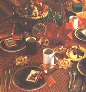 Посуда, скатерть, салфетки на праздничном столе часто имеют рождественскую символику, а возле каждой тарелки обязательно укладывается традиционная и всеми любимая рождественская хлопушка. Когда хлопушки взрываются, из них высыпаются конфетти, игрушки, всякие безделушки или небольшие записочки с какими-нибудь шутками.