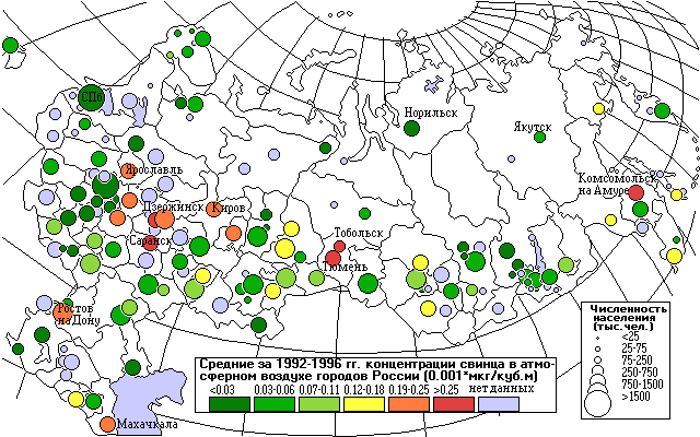 С выбросами промышленных предприятий в атмосферу в городах Российской Федерации поступает от 1,1 до 1,6 тыс. т свинца. Медики утверждают, что свинец обладает выраженным влиянием на нервную систему и зрение. Специальные исследования в городах Белово, Санкт-Петербург, Карабаш, Красноуральск, Саратов, Пермь, Чусовой подтвердили наличие зависимости между содержанием свинца в объектах окружающей среды и организме детей, а также неблагоприятное воздействие на здоровье. Почти у 2 млн детей в городах России могут возникать проблемы в поведении и обучении, обусловленные воздействием свинца; почти 400 тыс. детей нуждаются в лечении, здоровье около 10 тыс. детей находится в опасности и примерно 500 детям требуется неотложная медицинская помощь.