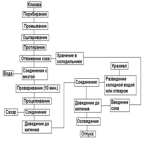 | Клюква | 126 | 120 | Клюкву или бруснику, или чернику или смородину, или вишню перебирают, удаляют плодоножки и моют, у вишни удаляют косточки. Плоды и ягоды протирают. Сок отжимают и процеживают. Мезгу заливают горячей водой (на 1 часть мезги 5 - 6 частей воды), проваривают при слабом кипении 10 - 15 мин и процеживают. В полученный отвар (часть его охлаждают и используют для разведения крахмала) добавляют сахар, доводят до кипения и при помешивании сразу вливают подготовленный крахмал. Вновь доводят до кипения и добавляют отжатый сок. Крахмал подготавливают следующим образом: Его разводят охлажденным отваром (на 1 часть крахмала 5 частей отвара) и процеживают. Алычу, или сливу, или мирабель (с удаленными косточками), или крыжовник варят с небольшим количеством воды в течение 7 - 10 мин, отвар сливают, ягоды или плоды протирают. В отвар добавляют сахар, пюре, доводят до кипения, вводят подготовленный крахмал и вновь доводят до кипения. Готовый кисель разливают в вазочки или стаканы с t 10 - 14°С по 120 - 200 гр. |