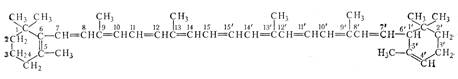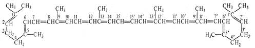 Одна из характерных особенностей этих соединений — наличие в них значительного числа сопряженных двойных связей, образующих их хромофорные группы, от которых зависит окраска. Все натуральные каротиноиды могут рассматриваться как производные ликопина — каротиноида, обнаруженного в плодах томатов, а также в некоторых ягодах и фруктах. Эмпирическая формула ликопина С40 Н56 . Строение ликопина представлено на рисунке 1